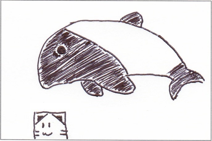 これ「パンダは、いるか?」のうえに いるのは パンダの かおを もした イルカだ!いまきづいた!